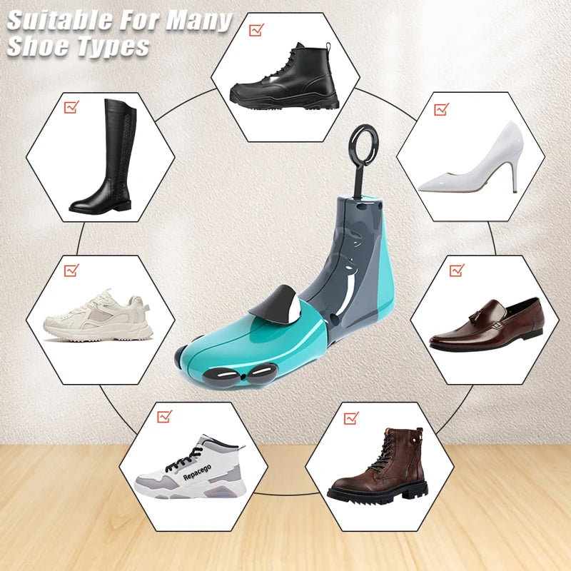 •The shoe stretchers provide 4-way stretching: Stretch width to widen shoe; Stretch length to increase shoe size; this Shoe stretchers are simple and work wonders for minimal stretching. Not only can they improve the fit of your favorite footwear, but can also help if you suffer from bunions, calluses, corns or other feet issues that cause pressure on the foot when inside of a shoe.